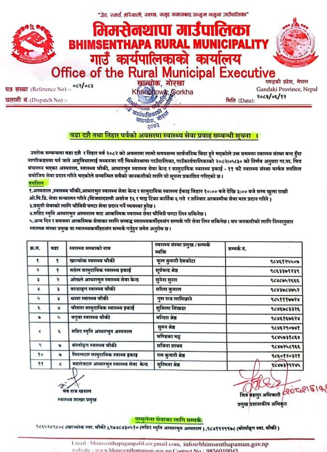 वडा दशै तथा तिहार पर्वको अवसरमा स्वास्थ्य सेवा प्रवाह सम्बन्धी सूचना ।