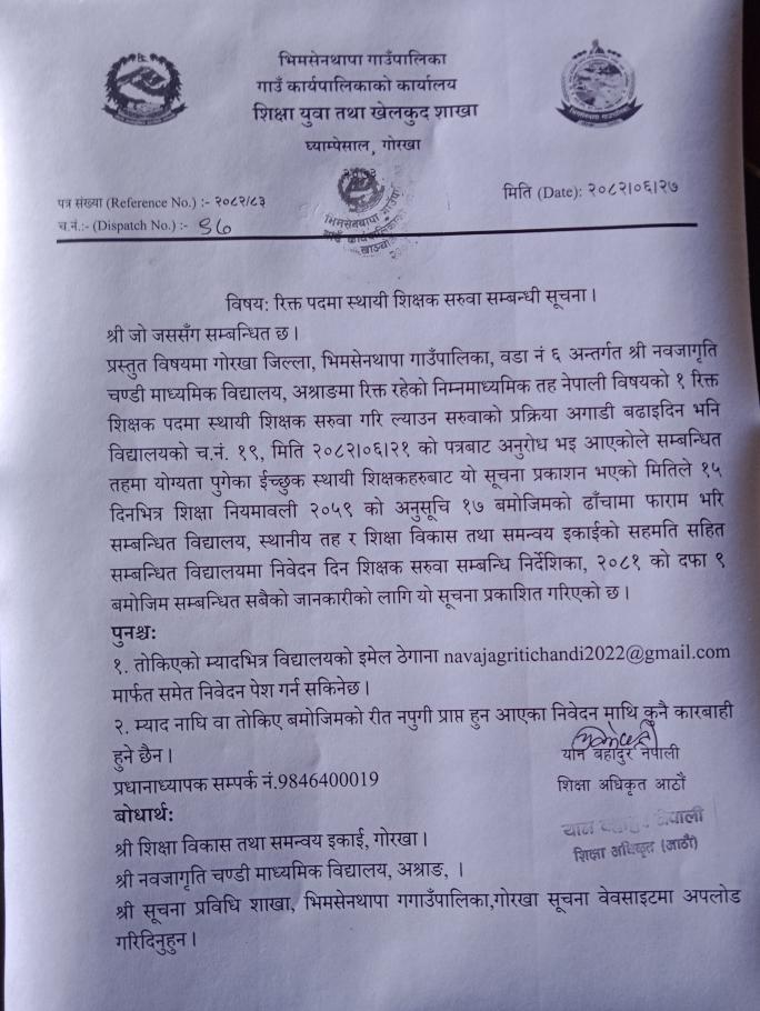शिक्षक आवश्कता सम्बन्धमा।