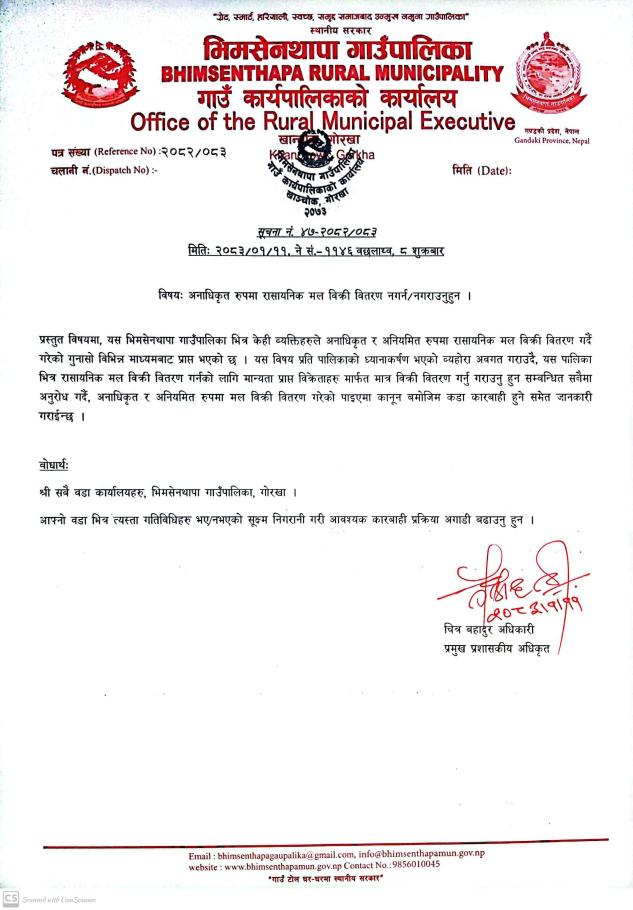 » अनाधिकृत रुपमा मल बिक्रि बितरण नगर्ने नगराउने सम्बन्धी सूचना ।
