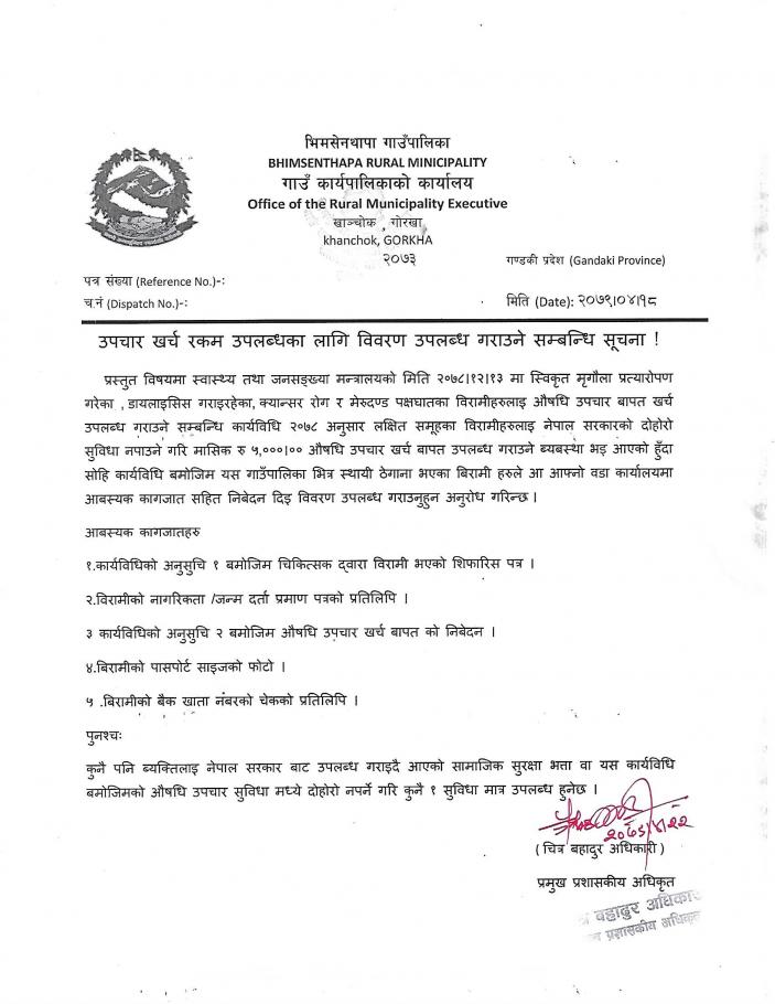 » उपचार खर्च रकम उपलब्धका लागि विवरण उपलब्ध गराउने सम्वन्धी सूचना ।