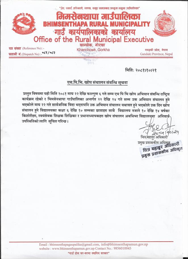 जानकारी सम्बन्धमा श्री वडा कार्यालय सबै भिमसेनथापा गाउँपालिका