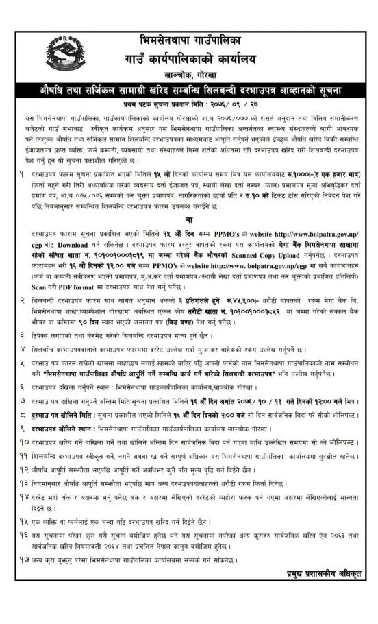 औषधि तथा सर्जिकल सामाग्री खरिद सम्बन्धी सिलबन्दी दरभाउपत्र आव्हानकाे सुचना ।