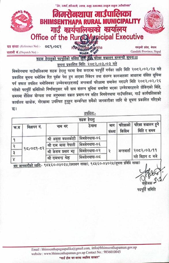 कर्मचारी पदपूर्तिको संक्षिप्त सुची तथा परिक्षा संचालन सम्बन्धी सूचना।