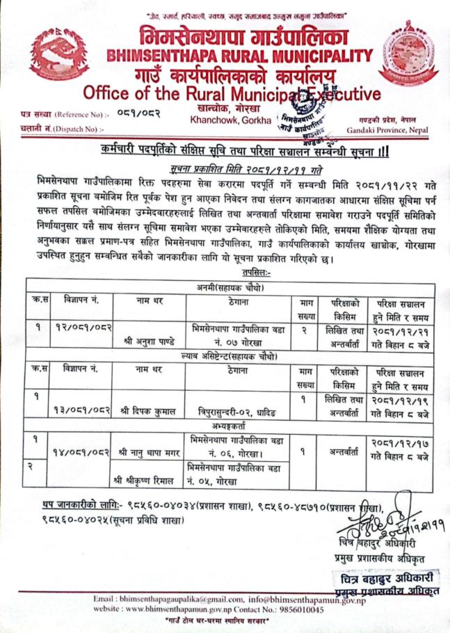 कर्मचारी पदपूर्तिको संक्षिप्त सुचि तथा परिक्षा संचालन सम्बन्धी सूचना।