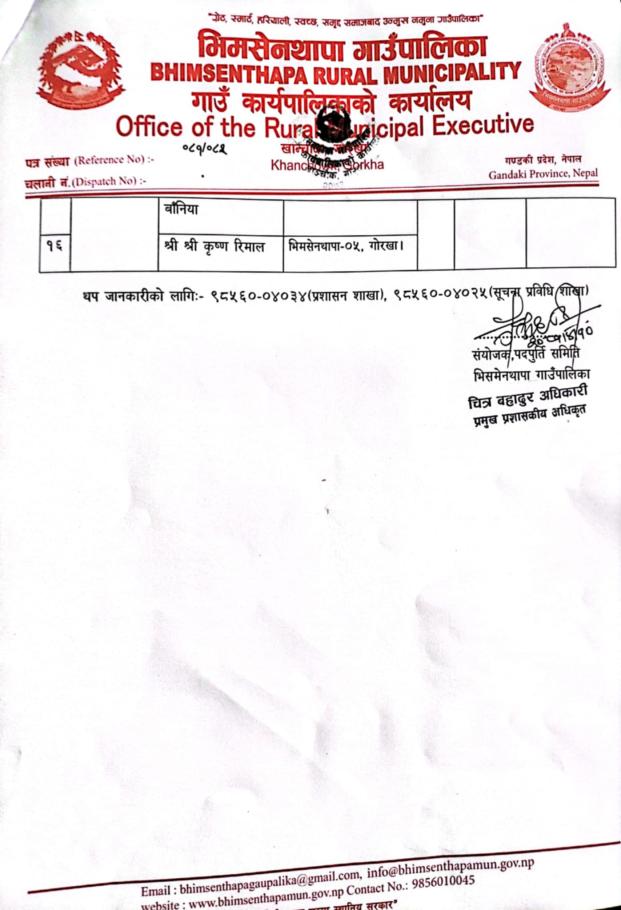 जानकारी सम्बन्धमा श्री वडा कार्यालय सबै भिमसेनथापा गाउँपालिका