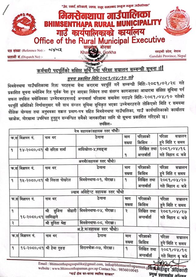कर्मचारी पदपूर्तिको संक्षिप्त सुची तथा परिक्षा संचालन सम्बन्धी सूचना।
