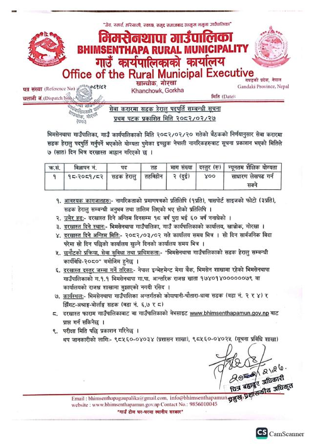 कर्मचारी (सडक हेरालु) पदपूर्ति सम्बन्धी सूचना।