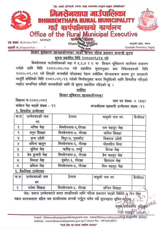 » किसान सूचिकारण सहजकर्ता (गणक) पदको अन्तिम नतिजा प्रकासन सम्बन्धी सूचना !!