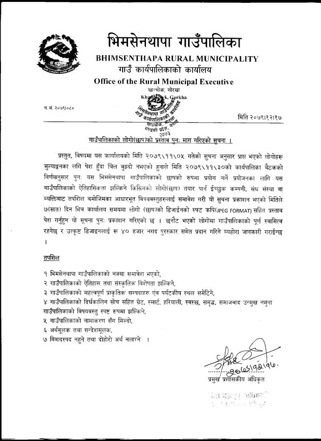 गाउँपालिकाको लोगो(छाप) सम्वन्धी प्रस्ताव मााग गरिएको सूचना!! (दोश्रो पटक प्रकाशीत सूचना )
