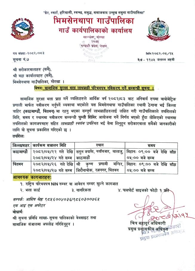 गाउँपालिका बाहिर रहनुहुने सामाजिक सुरक्षा भत्ता लाभग्राहीका लागि लाभग्राही परिचय पत्र नविकरण शिबिर संचालन हुने सम्बन्धी सूचना !