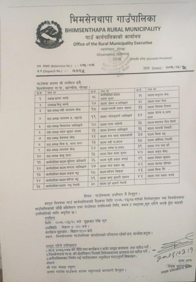 यस भिमसेनथापा गाउँपालिकाको पाँचौ गाउँसभा यही मिति २०७६।०३।२० गते बिहान ८:०० बजे गाउँपालिकाको कार्यालयको हलमा शुरु हुने भएकोले सम्पूर्ण गाउँसभा सदस्यहरुलाई जानकारी गरिसकेको छ। कुनै कारणबस सूचना प्राप्त नभएको भएमा यसै सूचनालाइ आधार मानी उपस्थित हुन को लागि अनुरोध छ ।