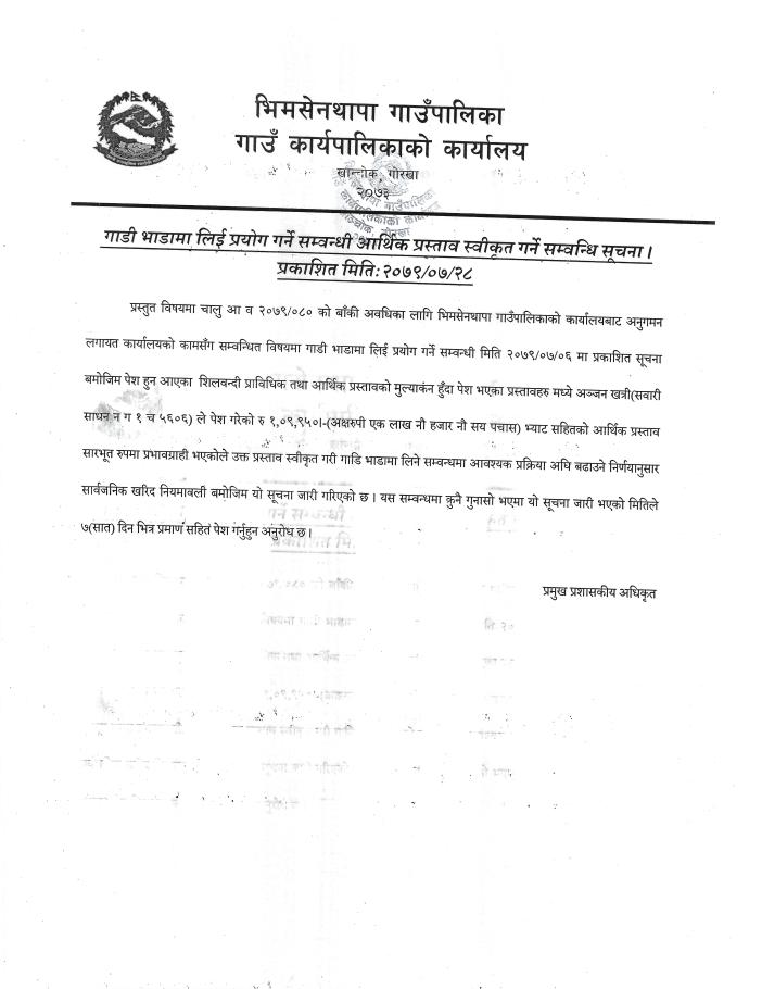 » गाडी भाडामा लिई प्रयोग गर्ने सम्बन्धी आर्थिक प्रस्ताब स्वीकृत गर्ने सम्बन्धी सूचना !