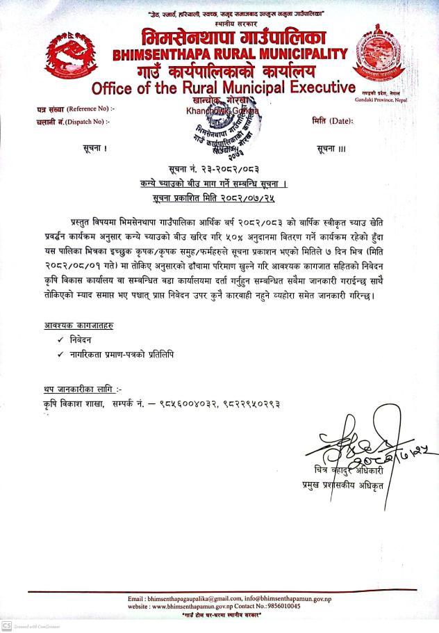जानकारी सम्बन्धमा श्री वडा कार्यालय सबै भिमसेनथापा गाउँपालिका