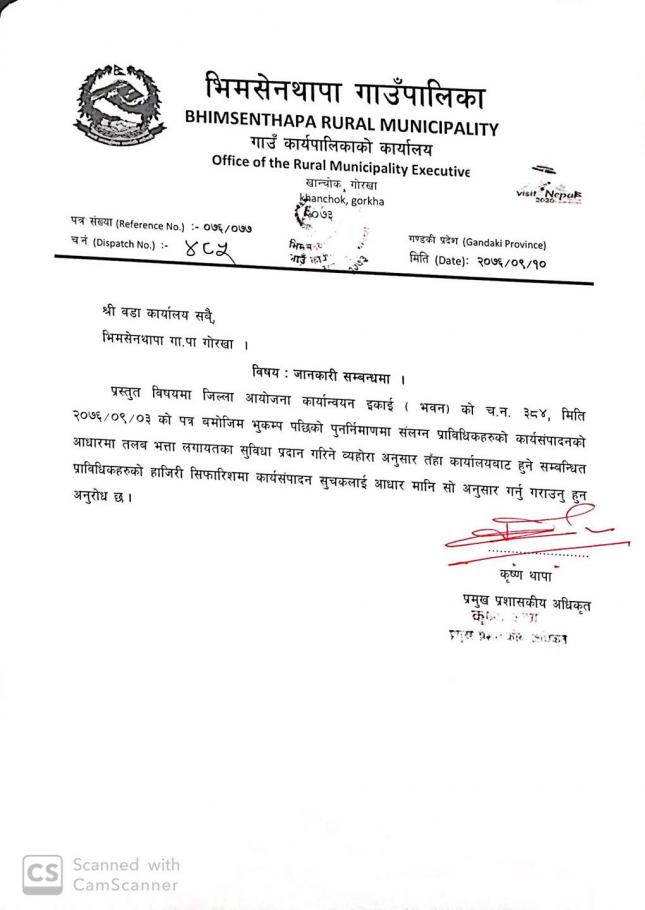जानकारी सम्बन्धमा श्री वडा कार्यालय सबै भिमसेनथापा गाउँपालिका