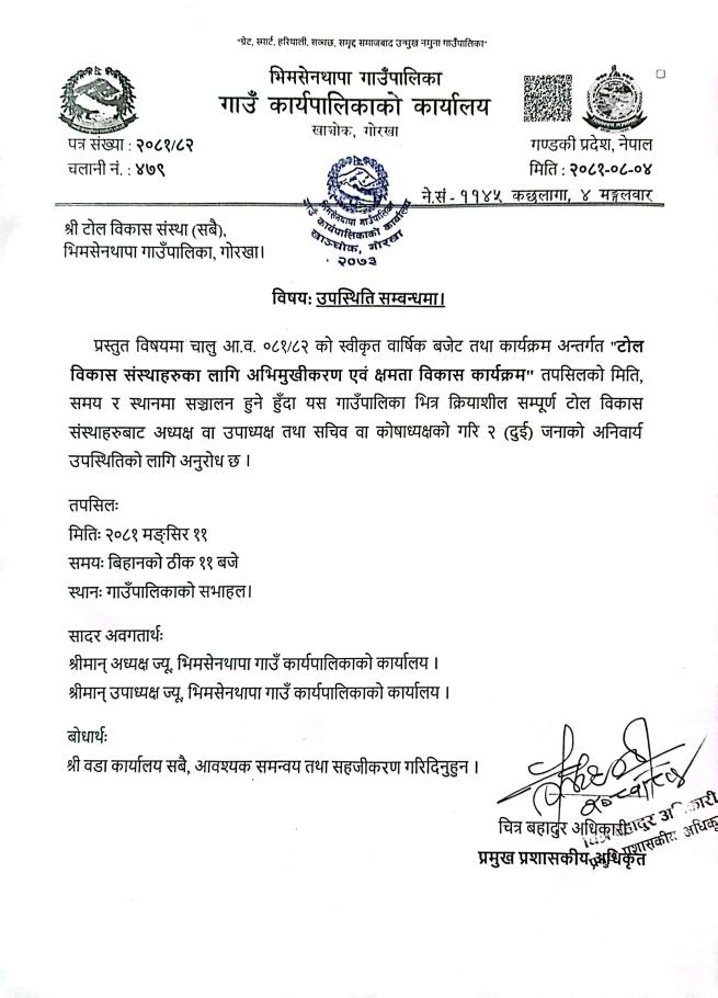 » टोल विकास संस्थाको अभिमुखीकरण एवं क्षमता विकस कार्यक्रममा उपस्थितिका लागि सूचना।