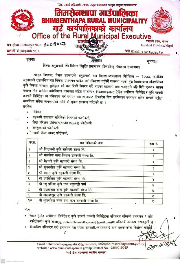 भिमसेनथापा गाउँपालिका क्षेत्रभित्रका व्यवसायीहरुको लागि सार्बजनिक सुचना ।।