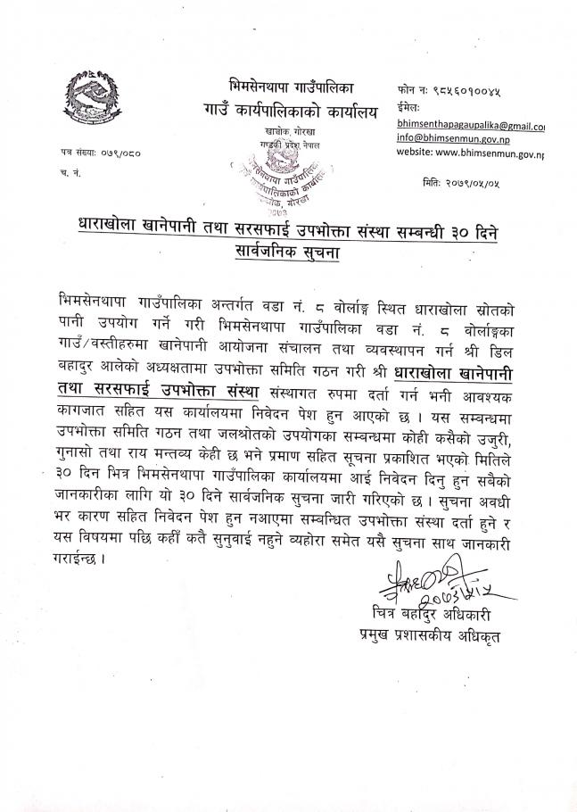 » धाराखोला खानेपानी तथा सरसफाई उपभोक्ता संस्था सम्वन्धी ३० दिने सार्वजानिक सूचना