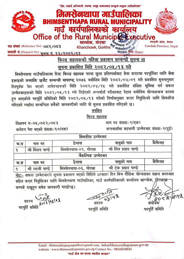 एम.आई.एस.अपरेटर र फिल्ड सहायक पदको नतिजा प्रकाशन सम्बन्धि सूचना