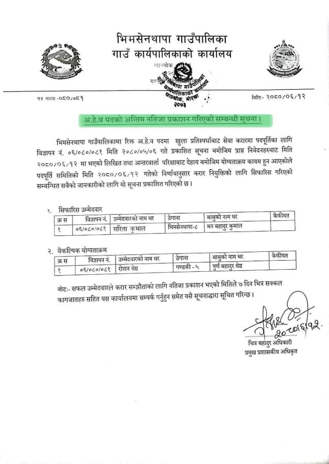 जानकारी सम्बन्धमा श्री वडा कार्यालय सबै भिमसेनथापा गाउँपालिका