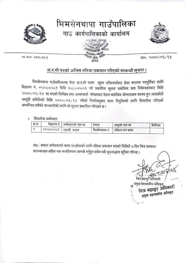 जानकारी सम्बन्धमा श्री वडा कार्यालय सबै भिमसेनथापा गाउँपालिका