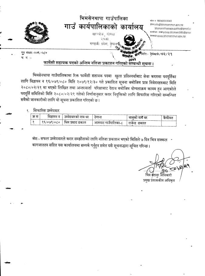 जानकारी सम्बन्धमा श्री वडा कार्यालय सबै भिमसेनथापा गाउँपालिका