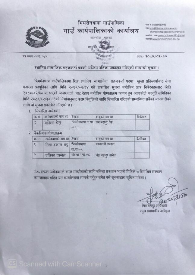 जानकारी सम्बन्धमा श्री वडा कार्यालय सबै भिमसेनथापा गाउँपालिका