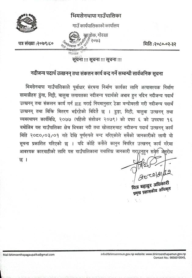 » नदीजन्य पदार्थ उत्खनन् तथा संकलन कार्य बन्द गर्ने सम्बन्धी सार्वजनिक सूचना !