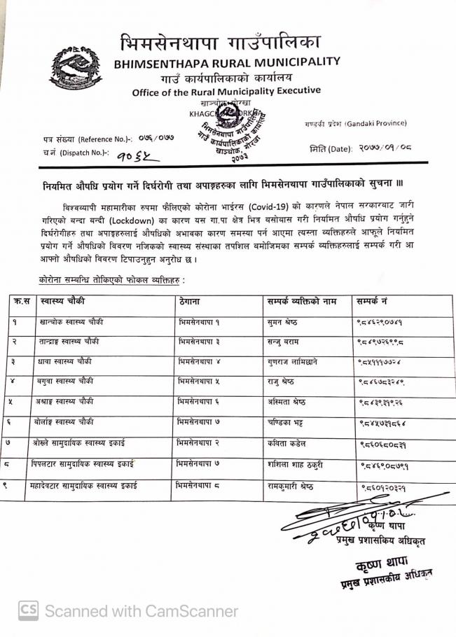 » नियमित औसधि प्रयोग गर्ने दिर्घरोगि तथा अपाङ्गहरुका लागि भिमसेनथापा गाउँपालिकाको सूचना !!!