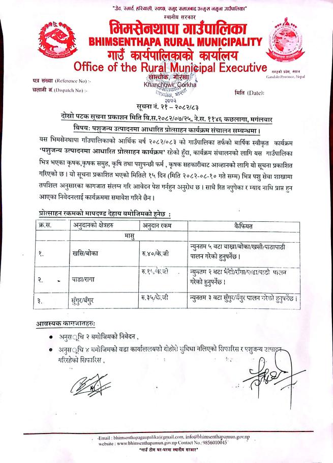 » पशुजन्य उत्पादनमा आधारित प्रोत्साहन कार्यक्रम संचालन सम्बन्धी दोश्रो पटक प्रकाशित सूचना।