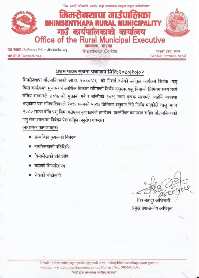जानकारी सम्बन्धमा श्री वडा कार्यालय सबै भिमसेनथापा गाउँपालिका