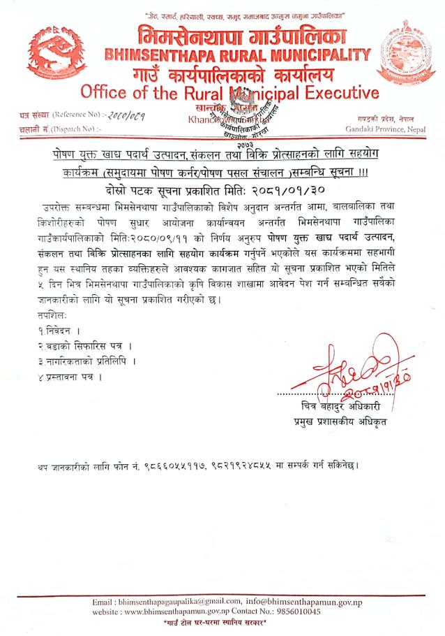 जानकारी सम्बन्धमा श्री वडा कार्यालय सबै भिमसेनथापा गाउँपालिका