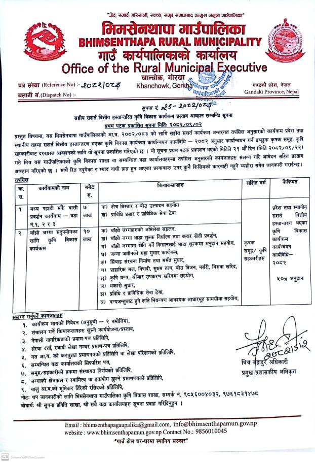 जानकारी सम्बन्धमा श्री वडा कार्यालय सबै भिमसेनथापा गाउँपालिका