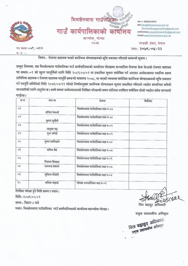 जानकारी सम्बन्धमा श्री वडा कार्यालय सबै भिमसेनथापा गाउँपालिका
