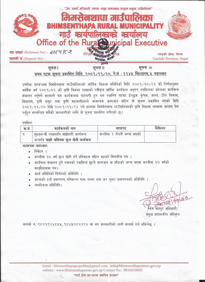 जानकारी सम्बन्धमा श्री वडा कार्यालय सबै भिमसेनथापा गाउँपालिका