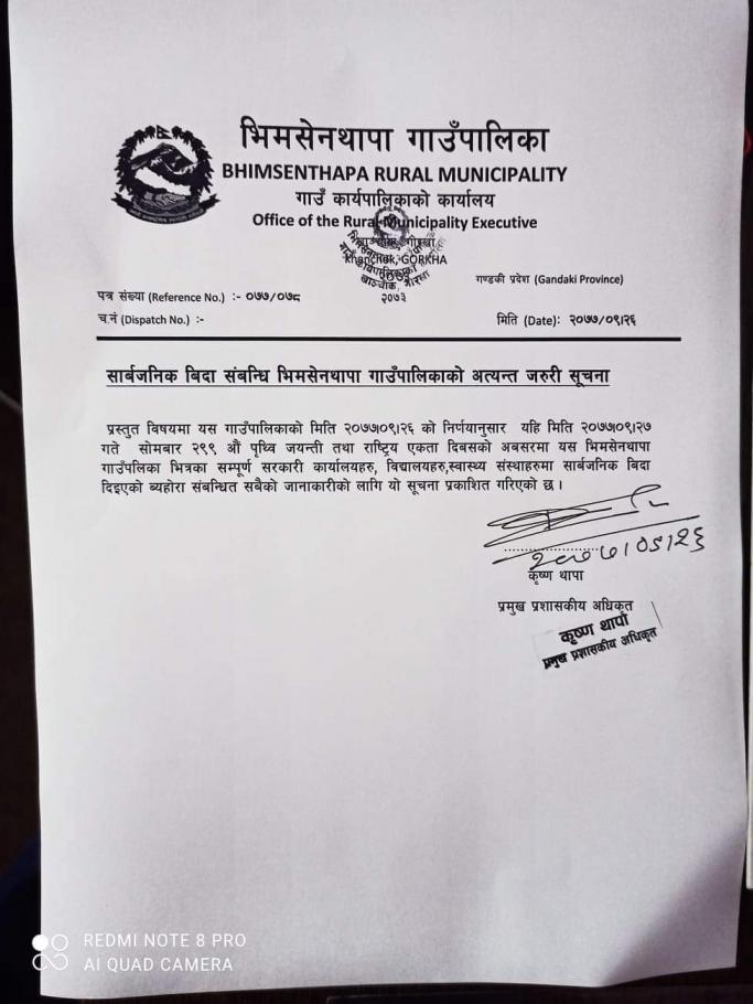 जानकारी सम्बन्धमा श्री वडा कार्यालय सबै भिमसेनथापा गाउँपालिका