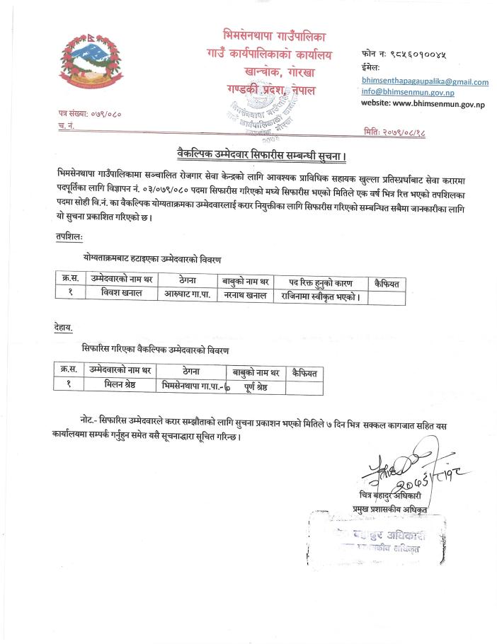 बैकल्पिक उम्मेदवारहरुको नियुक्ति एवं सम्झौताको लागि सम्पर्क राख्न आउने बारेको सूचना