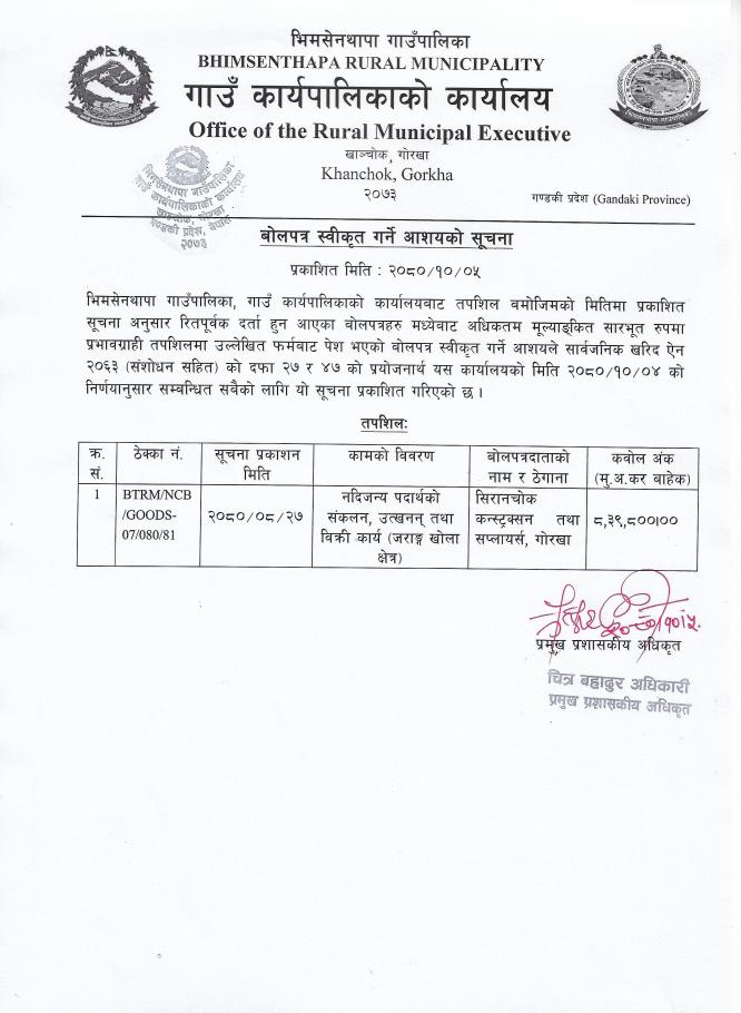 » बोलपत्र स्वीकृत गर्ने आशयको सूचना।