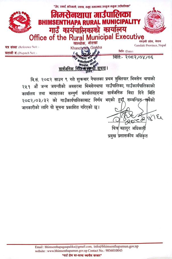 भिमसेन जयन्तीको अवसरमा सार्वजनिक विदा हुने सम्बन्धी सूचना ।