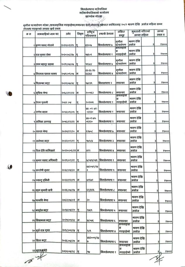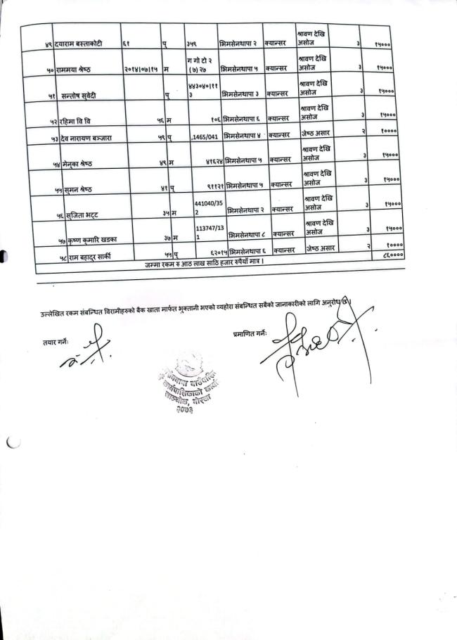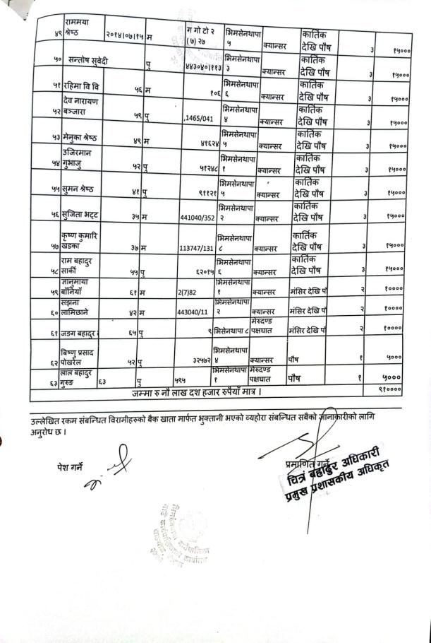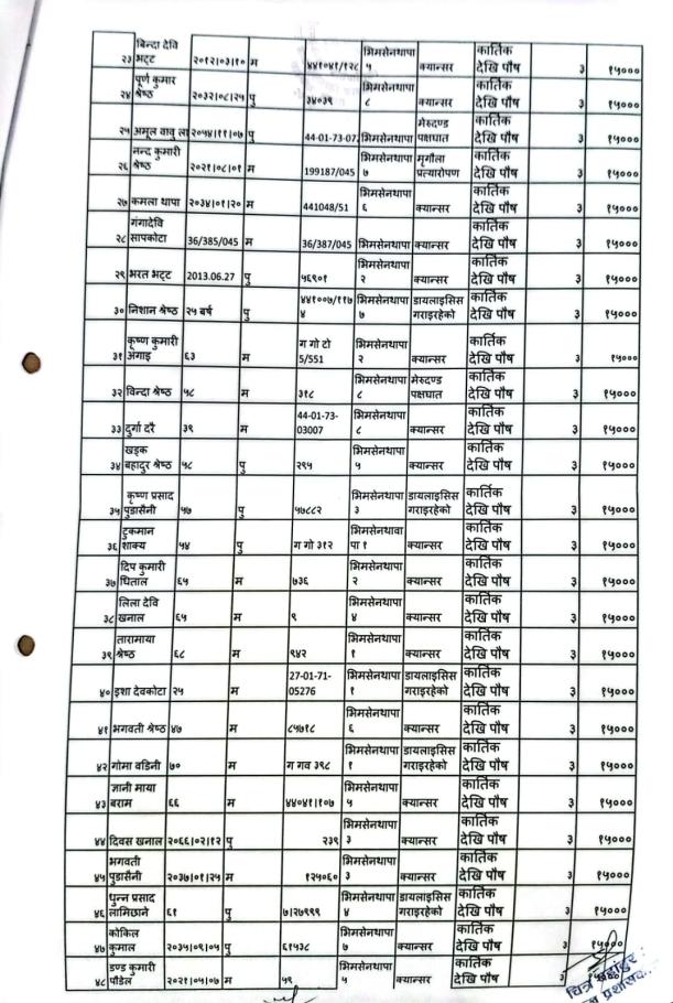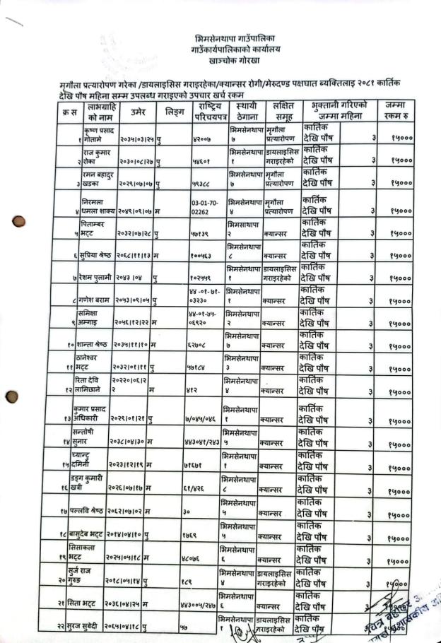 मृगौला प्रत्यारोपण गरेका/ डायलाइसिस गरेका/ क्यान्सर रोगी तथा मेरुदण्ड पक्षघात व्यक्तिहरु लाई २०८१ कार्तिक देखि पौष मसान्त सम्म उपलब्ध गराइएको उपचार खर्च सार्वजनिक गरिएको सम्बन्धी सूचना।