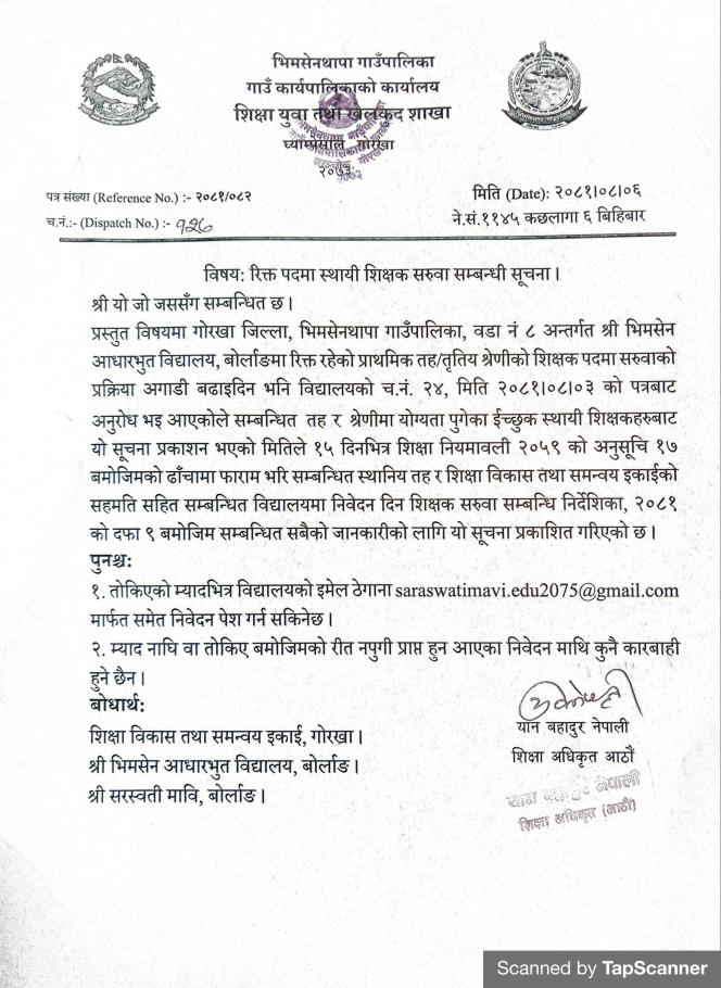 जानकारी सम्बन्धमा श्री वडा कार्यालय सबै भिमसेनथापा गाउँपालिका