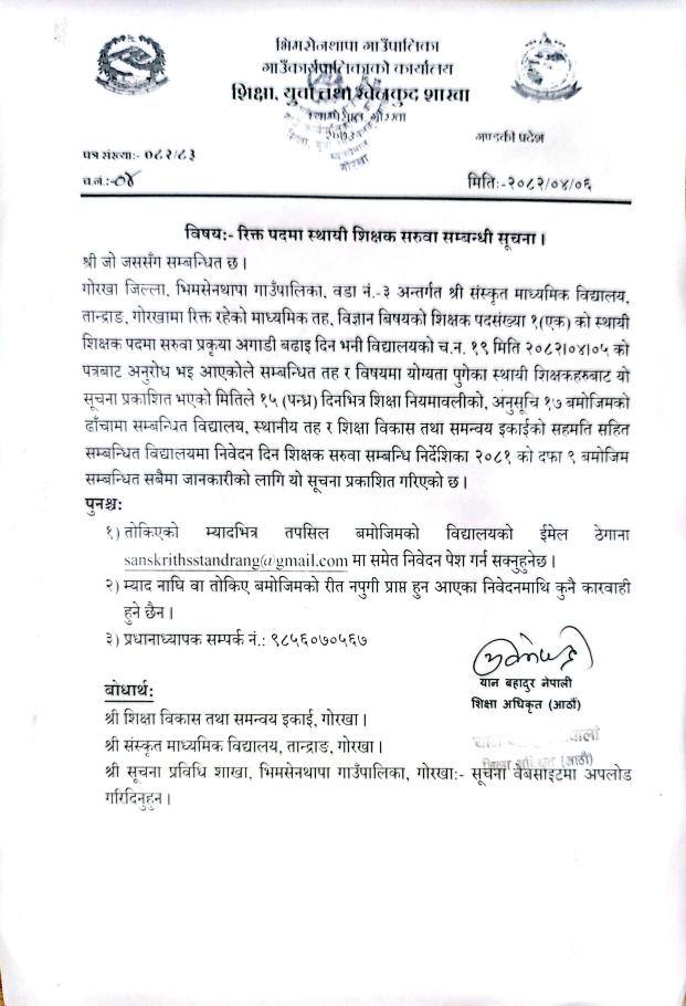 शिक्षक आवश्कता सम्बन्धमा।
