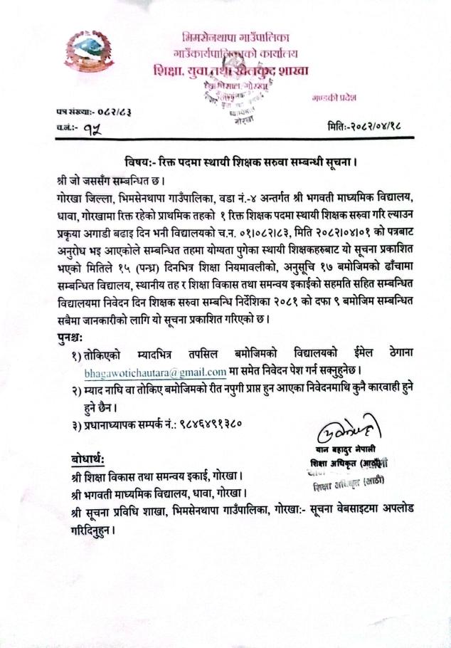 जानकारी सम्बन्धमा श्री वडा कार्यालय सबै भिमसेनथापा गाउँपालिका