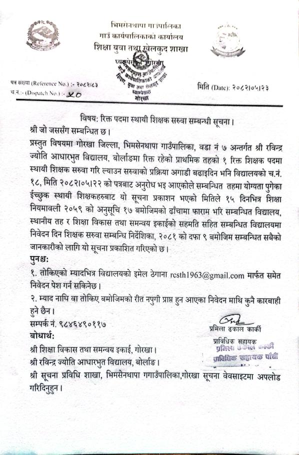 जानकारी सम्बन्धमा श्री वडा कार्यालय सबै भिमसेनथापा गाउँपालिका