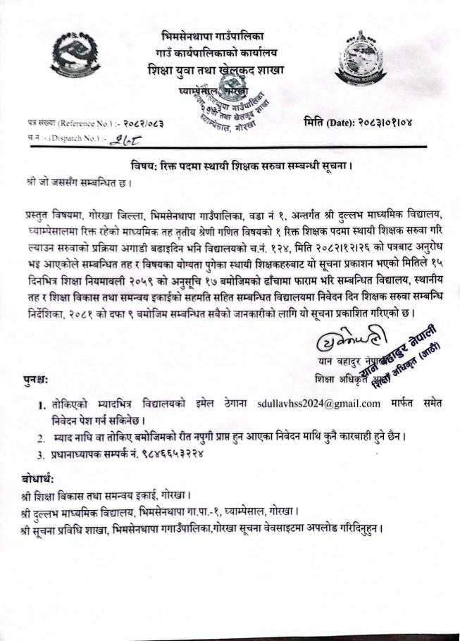 शिक्षक आवश्कता सम्बन्धमा।
