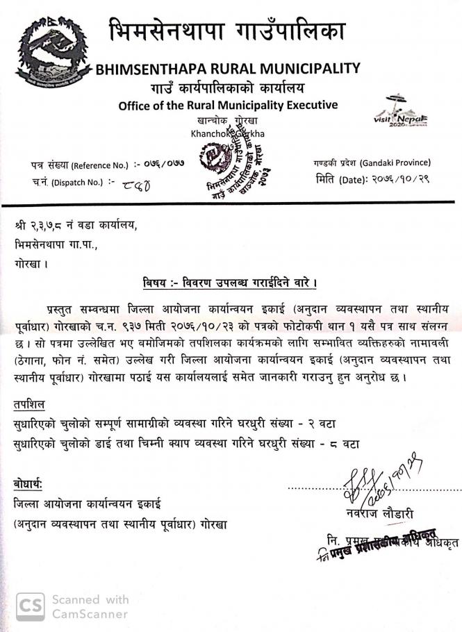 जानकारी सम्बन्धमा श्री वडा कार्यालय सबै भिमसेनथापा गाउँपालिका