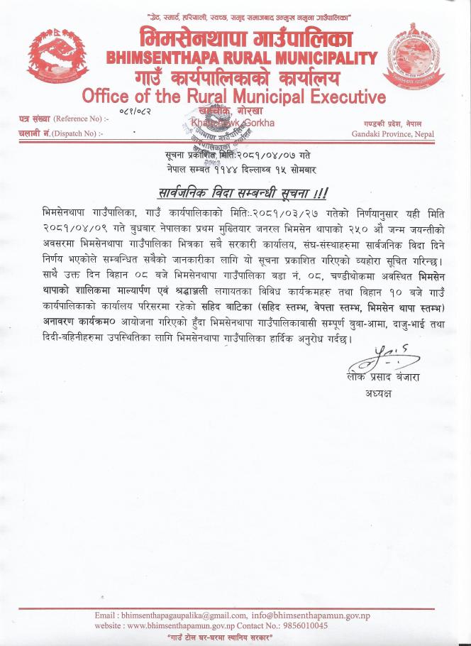 भिमसेन जयन्तीको अवसरमा सार्वजनिक विदा हुने सम्बन्धी सूचना ।