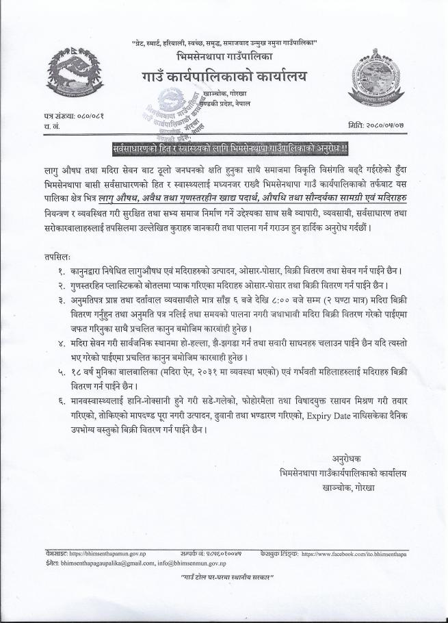 » सर्वसाधारणको हित र स्वास्थ्यको लागि भिमसेनाथापा गाउँपालिकाको अनुरोध !!