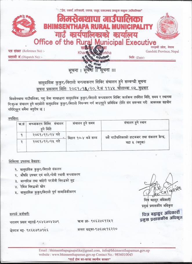 जानकारी सम्बन्धमा श्री वडा कार्यालय सबै भिमसेनथापा गाउँपालिका