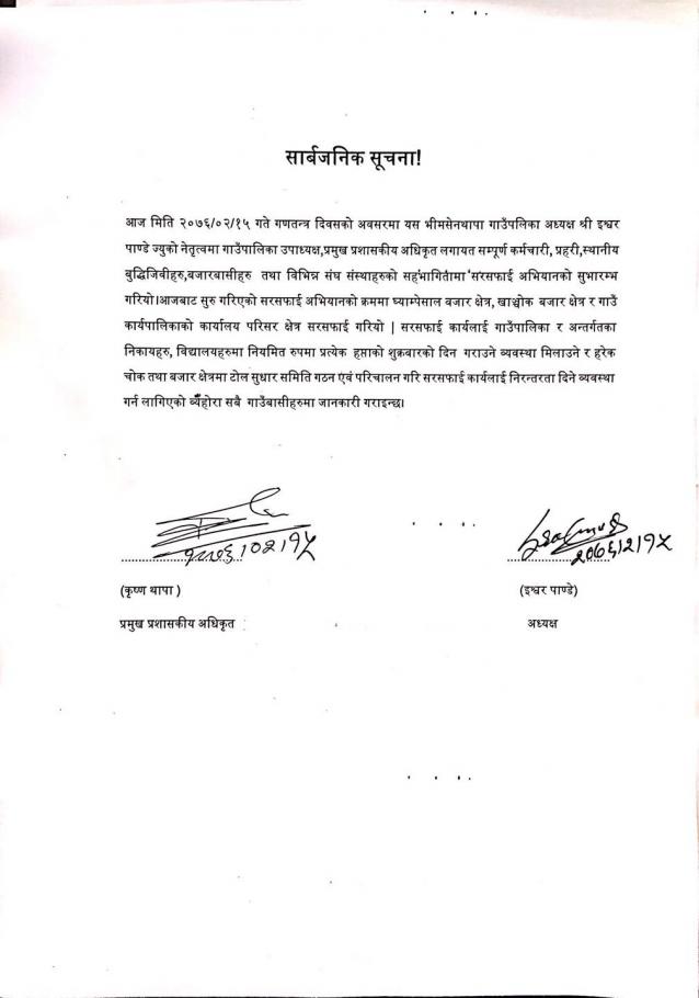आज मिति २०७६/०२/१५ गते गणतन्त्र दिवसको अवसरमा यस भीमसेनथापा गाउँपलिका अध्यक्ष श्री इश्वर पाण्डे ज्युको नेतृत्वमा गाउँपालिका उपाध्यक्ष,प्रमुख प्रशासकीय अधिकृत लगायत सम्पूर्ण कर्मचारी, प्रहरी,स्थानीय बुद्धिजिवीहरु,बजारबासीहरु तथा विभिन्न संघ संस्थाहरुको सहभागितामा सरसफाई अभियानको सुभारम्भ गरियो | आजबाट सुरु गरिएको सरसफाई अभियानको क्रममा घ्याम्पेसाल बजार क्षेत्र, खन्चोक बजार क्षेत्र र गाउँ कार्यपालिकाको कार्यालय परिसर क्षेत्र सरसफाई गरियो | सरसफाई कार्यलाई गाउँ पालिका र अन्तर्गतका निकायहरु, विद्यालयहरुमा नियमित रुपमा प्रत्येक हप्ताको शुक्रबारको दिन गराउने व्यवस्था मिलाउने र हरेक चोक तथा बजार क्षेत्रमा टोल सुधार समिति गठन एवं परिचालन गरि सरसफाई कार्यलाई निरन्तरता दिने व्यवस्था गर्न लागिएको व्येहोरा सबै गाउँबासीहरुमा जानकारी गराइन्छ|