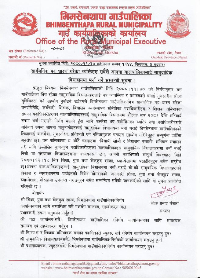 जानकारी सम्बन्धमा श्री वडा कार्यालय सबै भिमसेनथापा गाउँपालिका